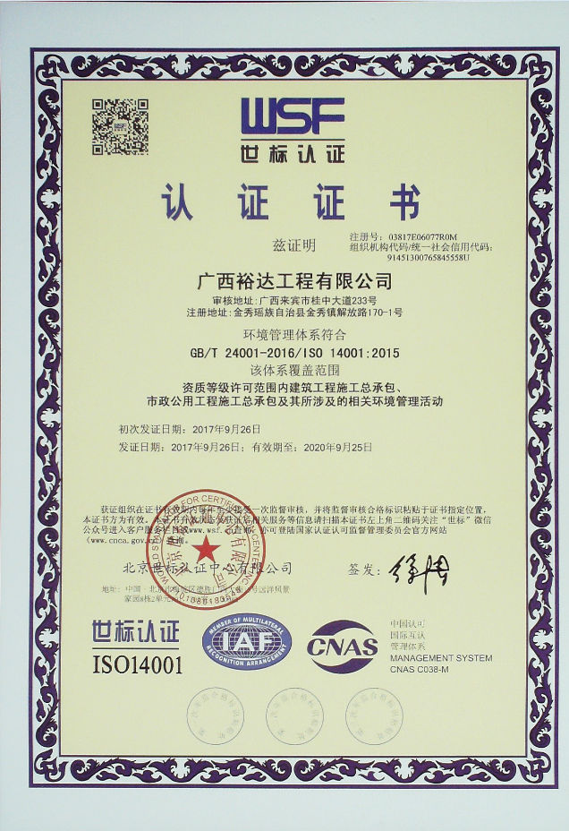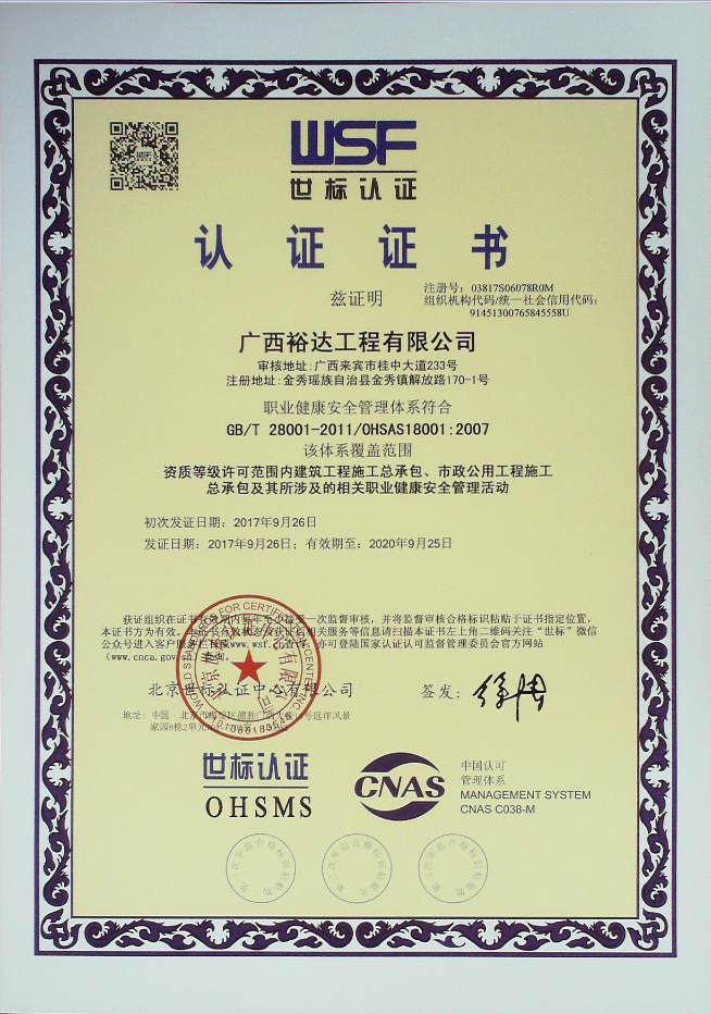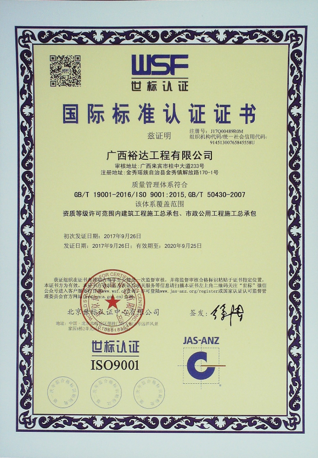 2017年9月7日至16日,经过专家组两轮现场审核,星空网页版·官方站在线登入顺利通过了GB/T19001-2016《质量管理体系》、GB/T24001-2016《环境管理体系》、GB/T28001—2011《职业健康安全管理体系》、GB/T50430-2007《工程建设施工企业质量管理规范》三标一体的认证,并于2017年9月26日获得由北京世标认证中心有限公司颁发的ISO9001:2015、GB/T50430-2007、ISO14001:2015和GB/T 28001-2011的认证证书。