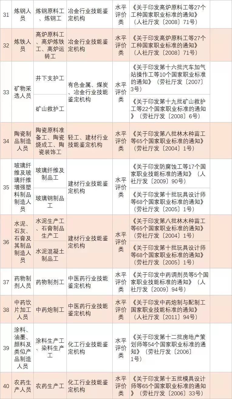 (四)深化技能人员职业资格制度改革。巩固职业资格改革成果,完善国家职业资格目录。对准入类职业资格,继续保留在国家职业资格目录内。对关系公共利益或涉及国家安全、公共安全、人身健康、生命财产安全的水平评价类职业资格,要依法依规转为准入类职业资格。对与国家安全、公共安全、人身健康、生命财产安全关系不密切的水平评价类职业资格,要逐步调整退出目录,对其中社会通用性强、专业性强、技术技能要求高的职业(工种),可根据经济社会发展需要,实行职业技能等级认定。