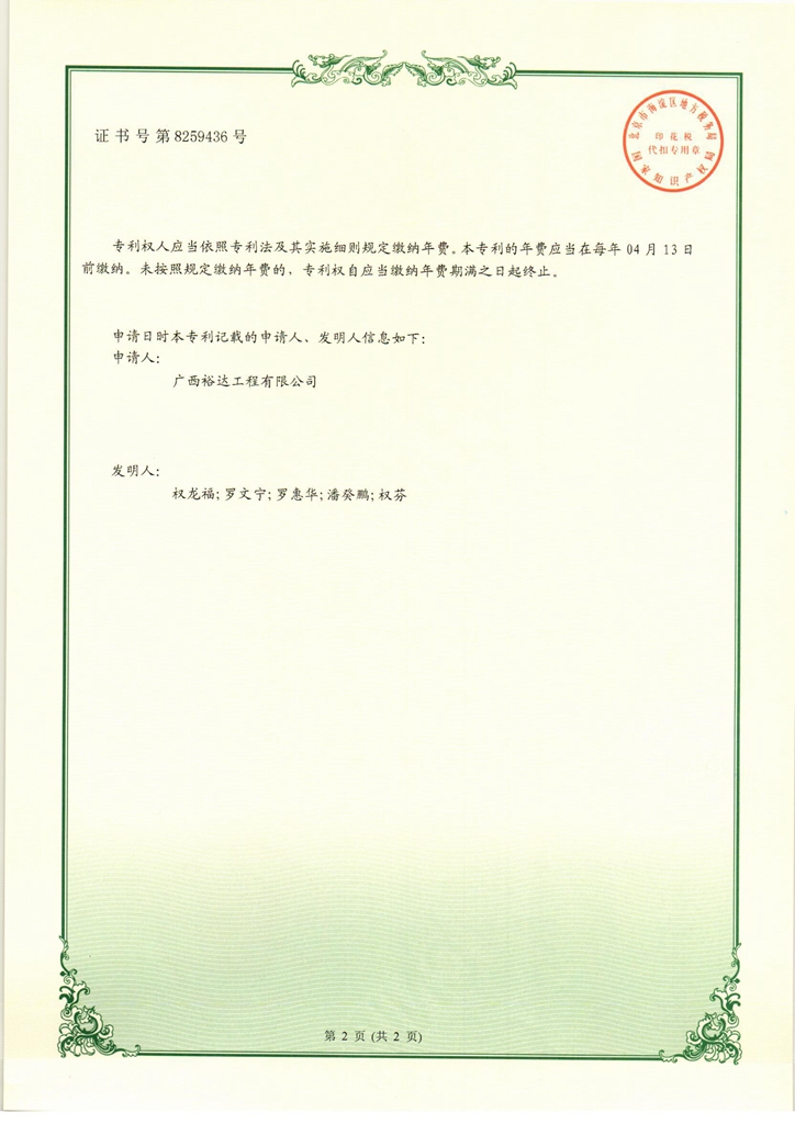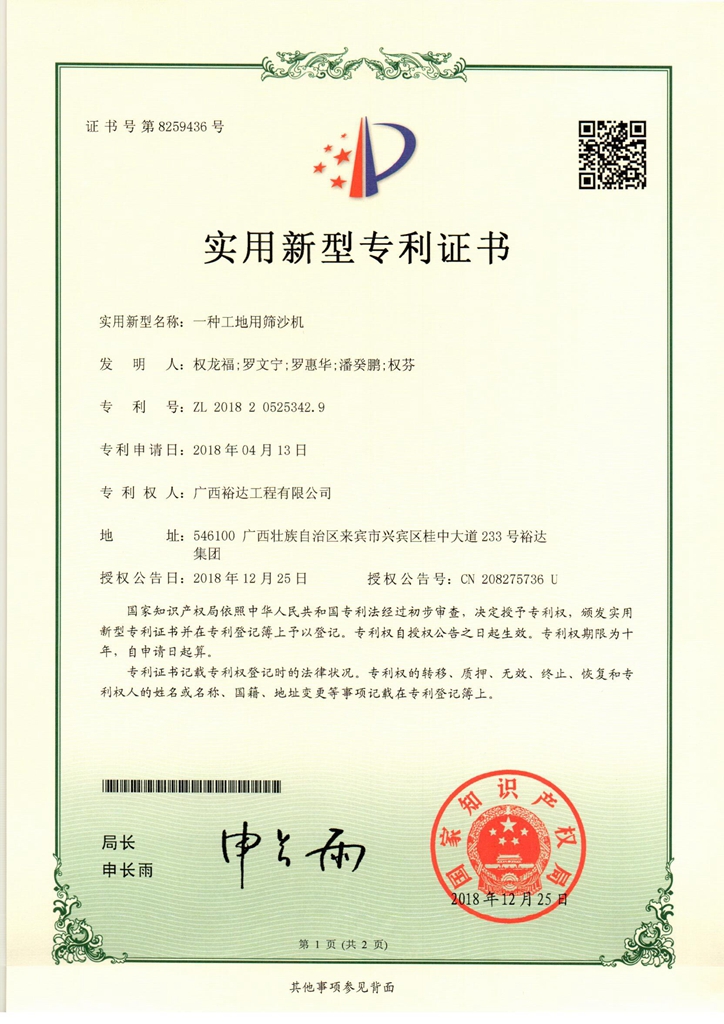 2018年实用新型专利证书(一种工地用筛沙机)