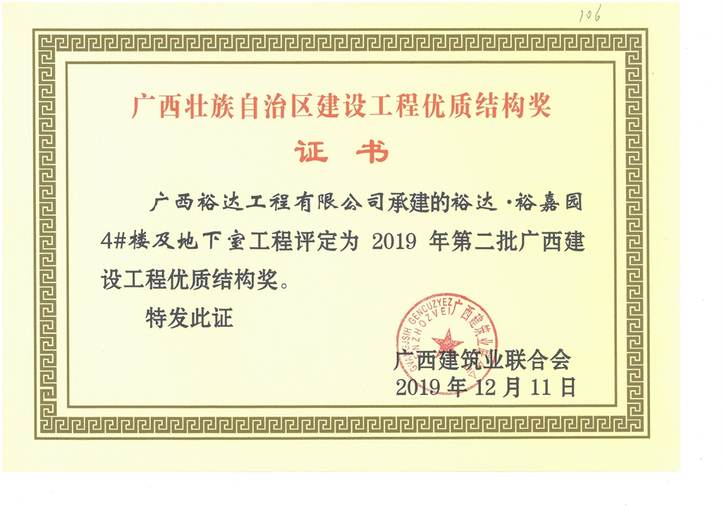 裕达·裕嘉园4#楼及地下室工程评定为2019年第二批广西建设工程优质结构奖